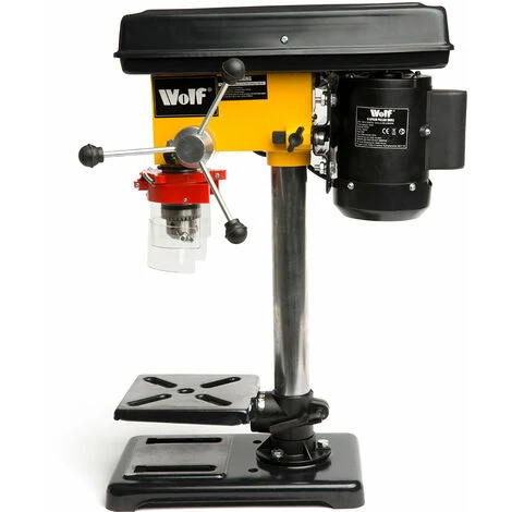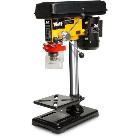 Built to last, the Wolf Engineer’s 9 speed Bench Pillar drill ,has the headstock manufactured in high quality cast iron, the base and column are of accurately machined cast steel and may be secured permanently to most types of workbench or stand to provide a reliable, accurate and easy to control eye level pillar drill. The 16mm keyed chuck is held in place by a JT hobby style taper drive shaft similar to the shafts used on industrial style pillar drills fitted with morse tapers. The vertical operation of the chuck is controlled by the three-spindle side handle. Safety dictates that a transparent chuck guard is fitted and an adjustable depth gauge comes as standard.