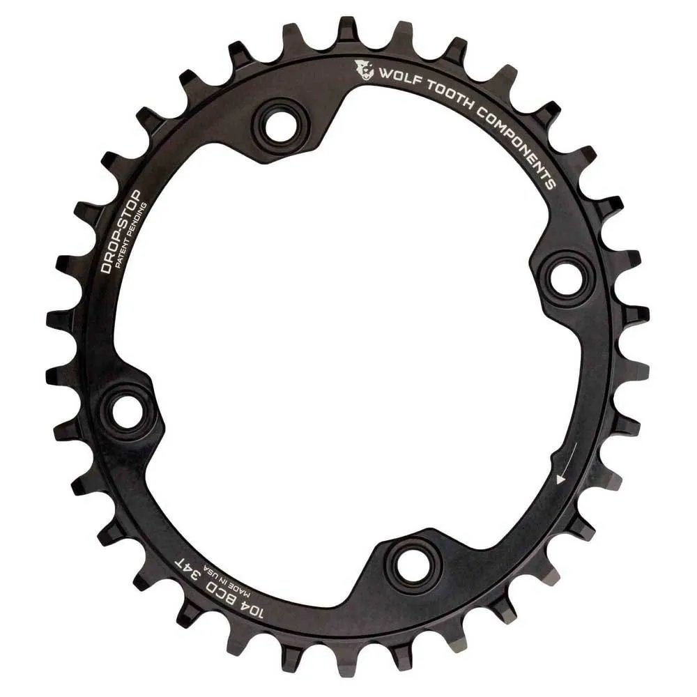 Drop-Stop technology. On Wolf Tooth’s patented wide/narrow chainring, the wide side of the tooth has maximum contact on the drive side which spreads the load and improves chainring life. The narrow side allows clearance for mud and debris which reduces friction. Alternating wide/narrow tooth pattern prevents chain derailment.