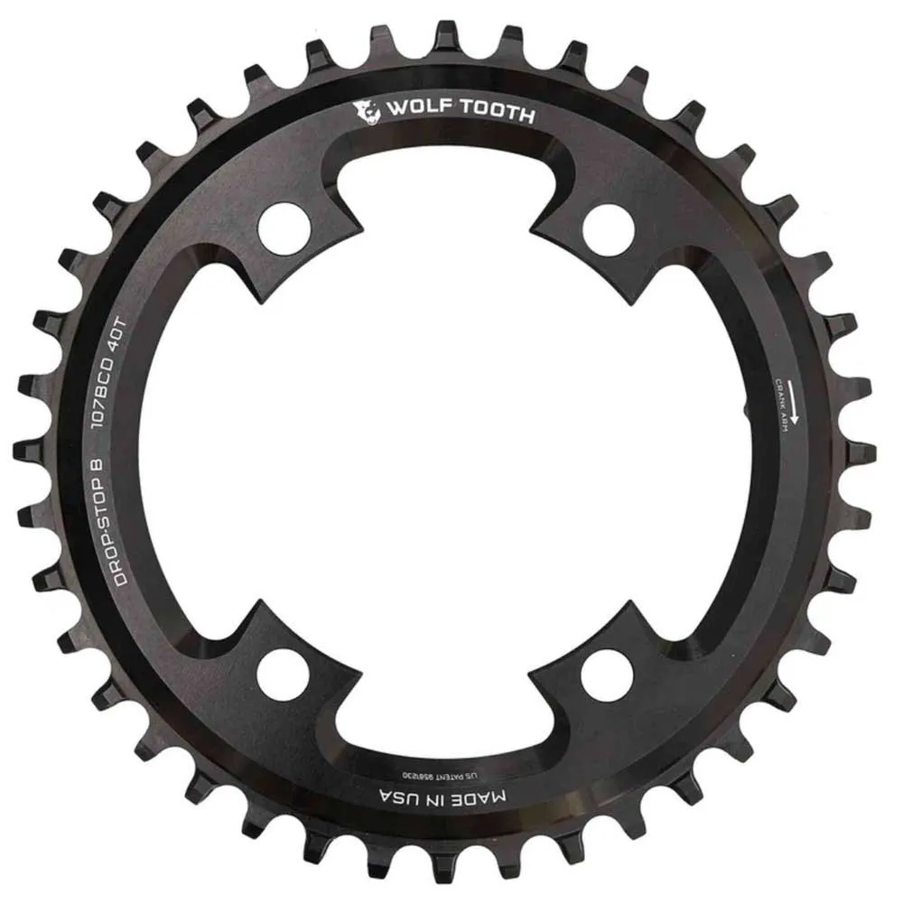 – Drop-Stop technology prevents dropped chains. On Wolf Tooth’s patented wide/narrow chainring, the wide side of the tooth has maximum contact on the drive side which spreads the load and improves chainring life. The narrow side allows clearance for mud and debris while reducing friction.