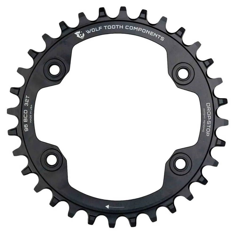 – Drop-Stop technology. On Wolf Tooth’s patented wide/narrow chainring, the wide side of the tooth has maximum contact on the drive side which spreads the load and improves chainring life. The narrow side allows clearance for mud and debris which reduces friction.