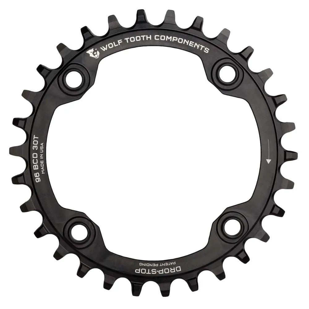 – Drop-Stop technology. On Wolf Tooth’s patented wide/narrow chainring, the wide side of the tooth has maximum contact on the drive side which spreads the load and improves chainring life. The narrow side allows clearance for mud and debris which reduces friction.